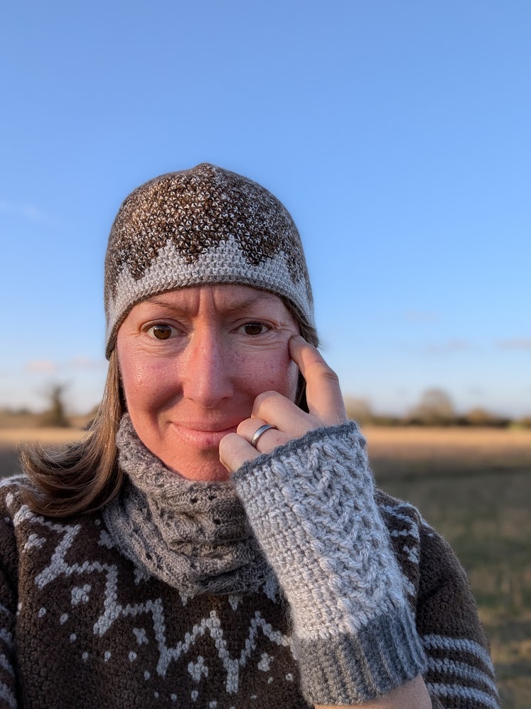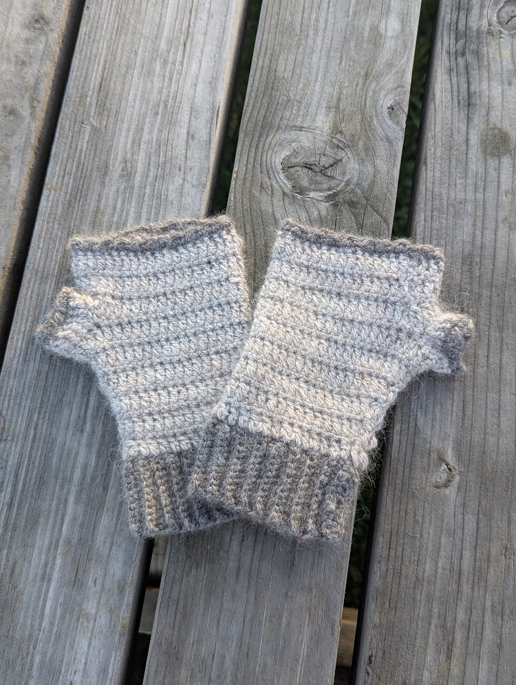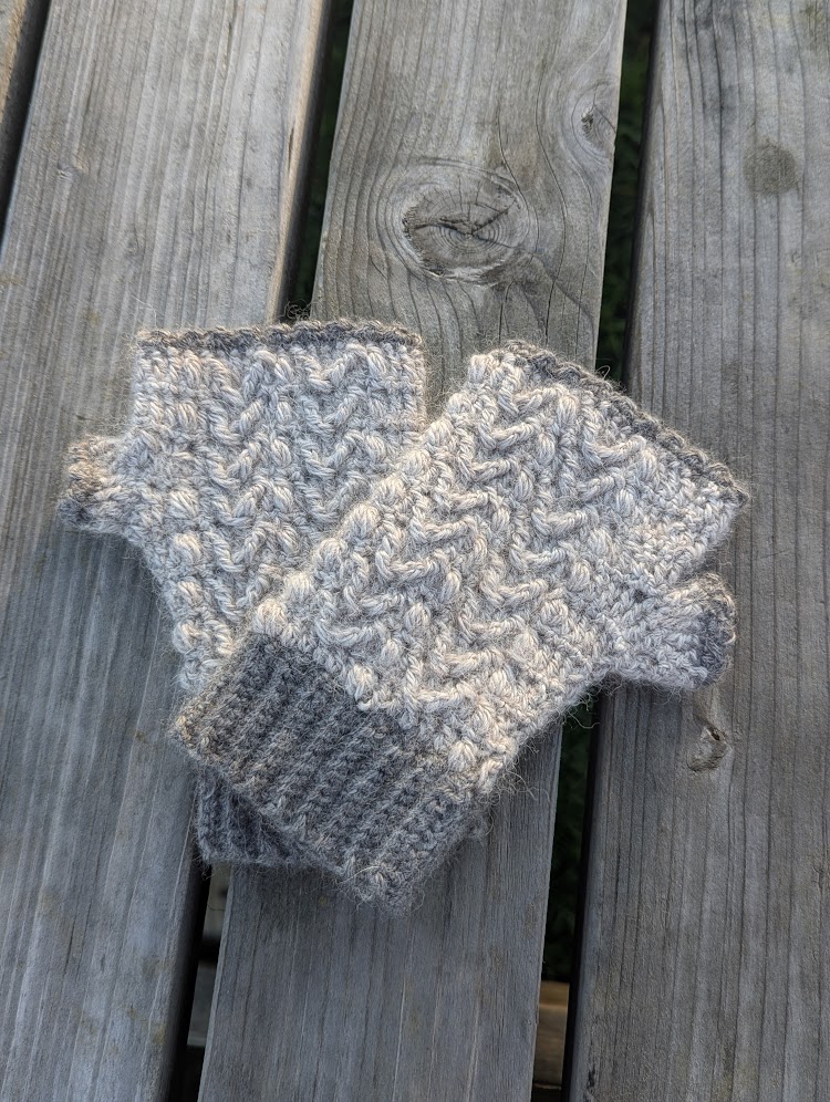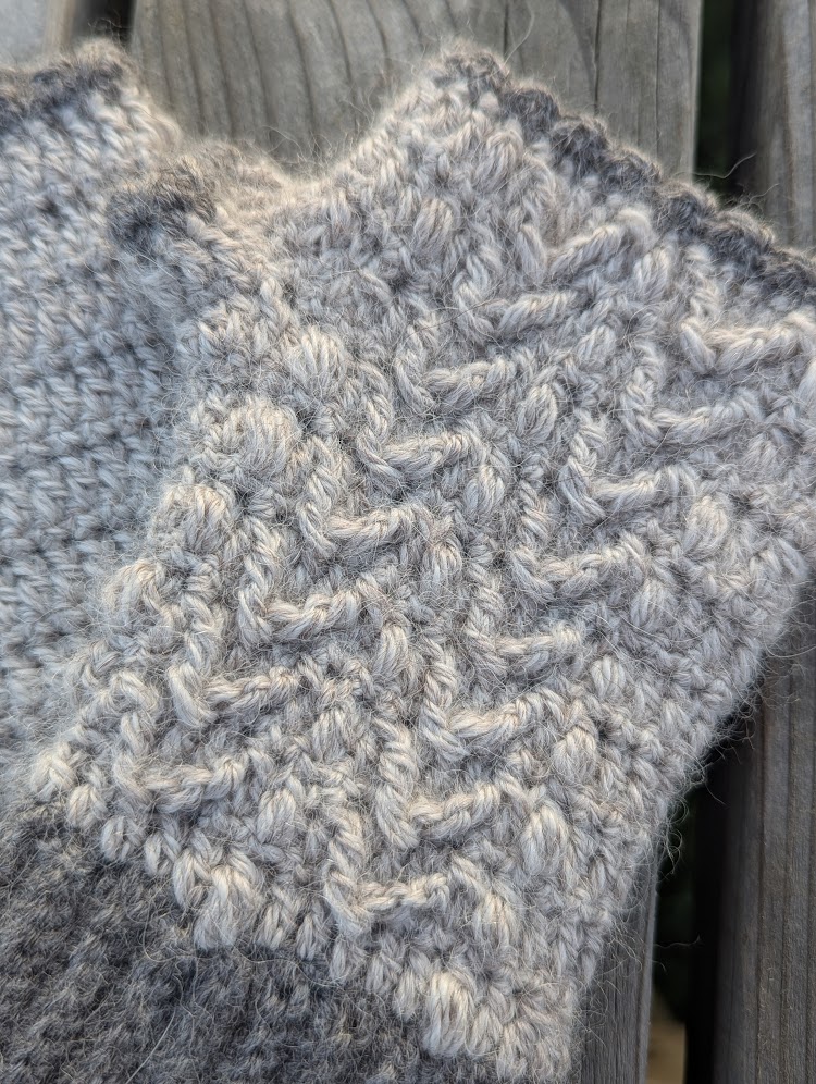 Beautifully soft wrist warmers in dove grey with goose grey ribbed cuff and shell trim. Hand crocheted by Kath in alpaca yarn with a cable pattern. Pattern is Meditate Mitts by Katherine Laight.