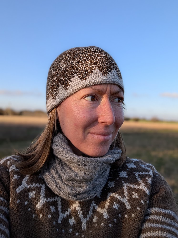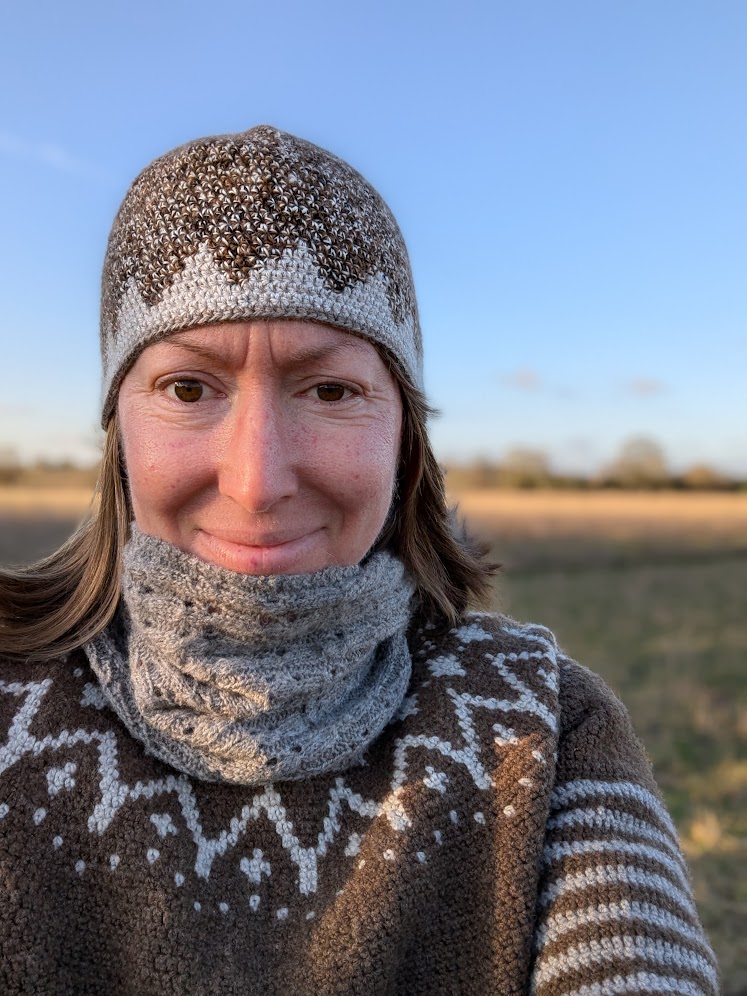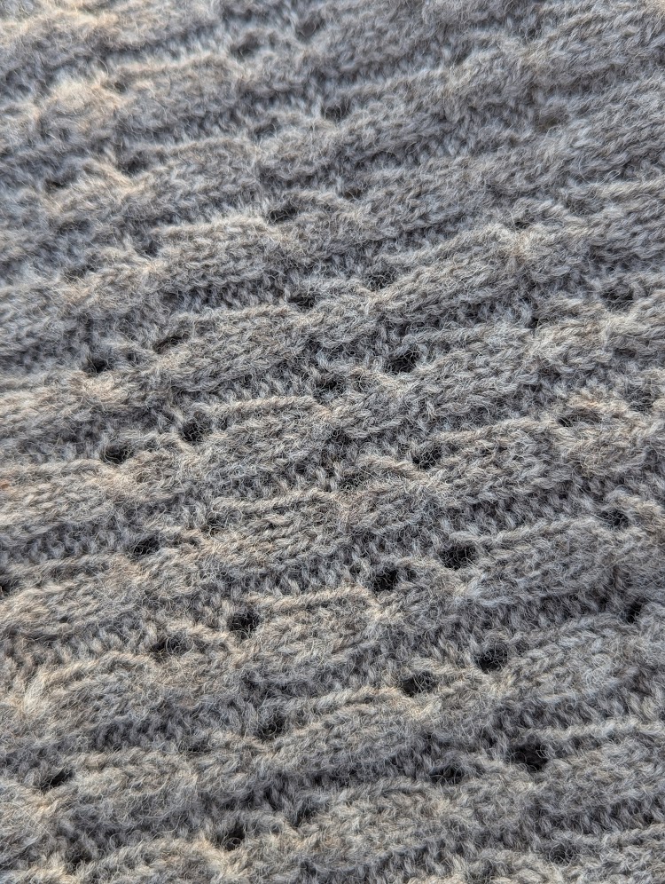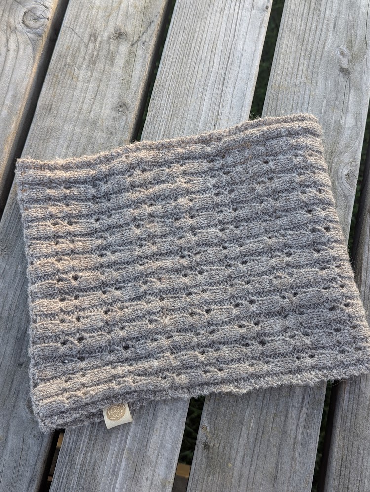 Soft and lightweight snood hand knitted with our laceweight pebble grey Shetland wool. Lace design in rows. Pattern is ‘Tender Scarf’ by Maanel.